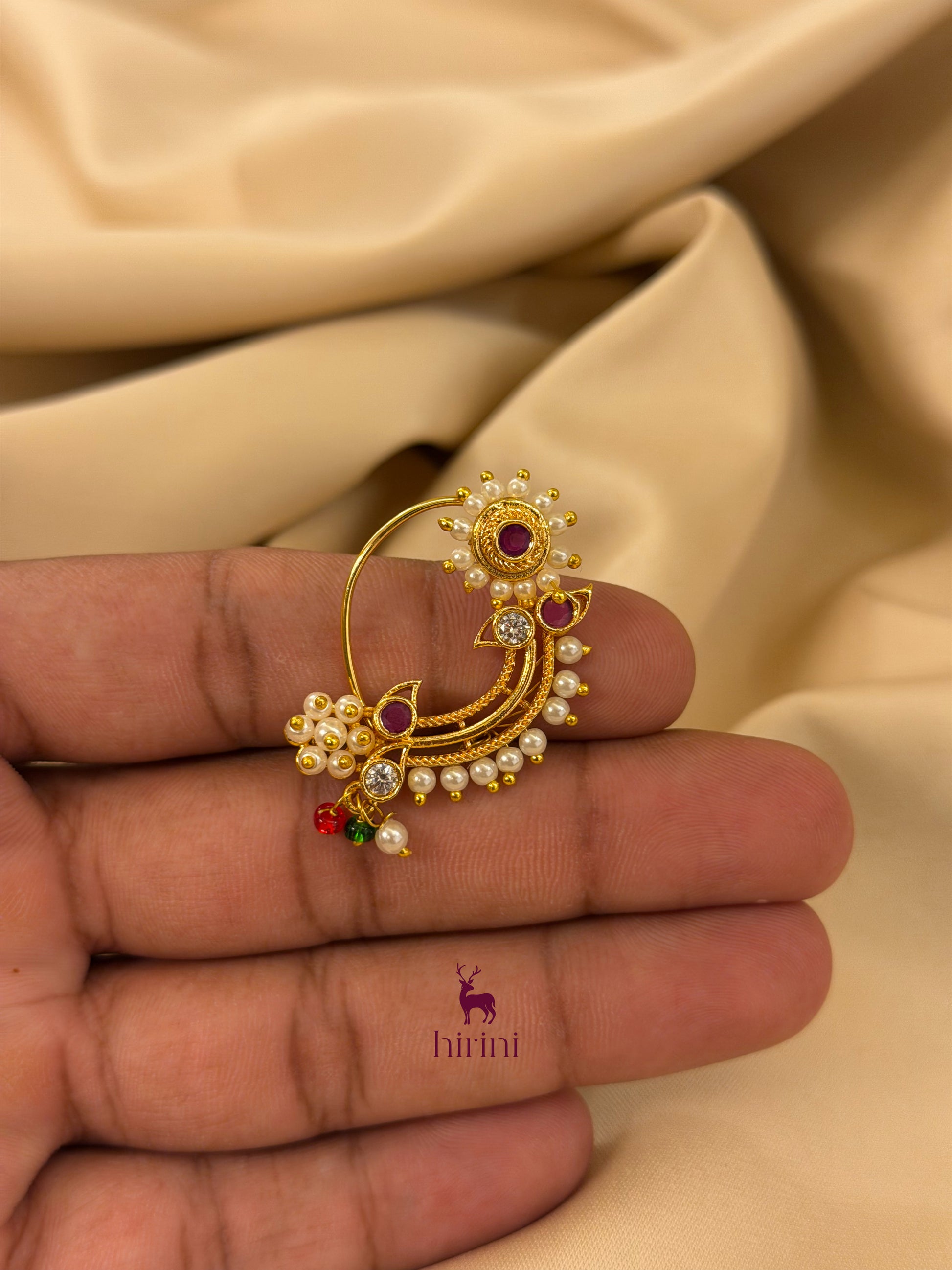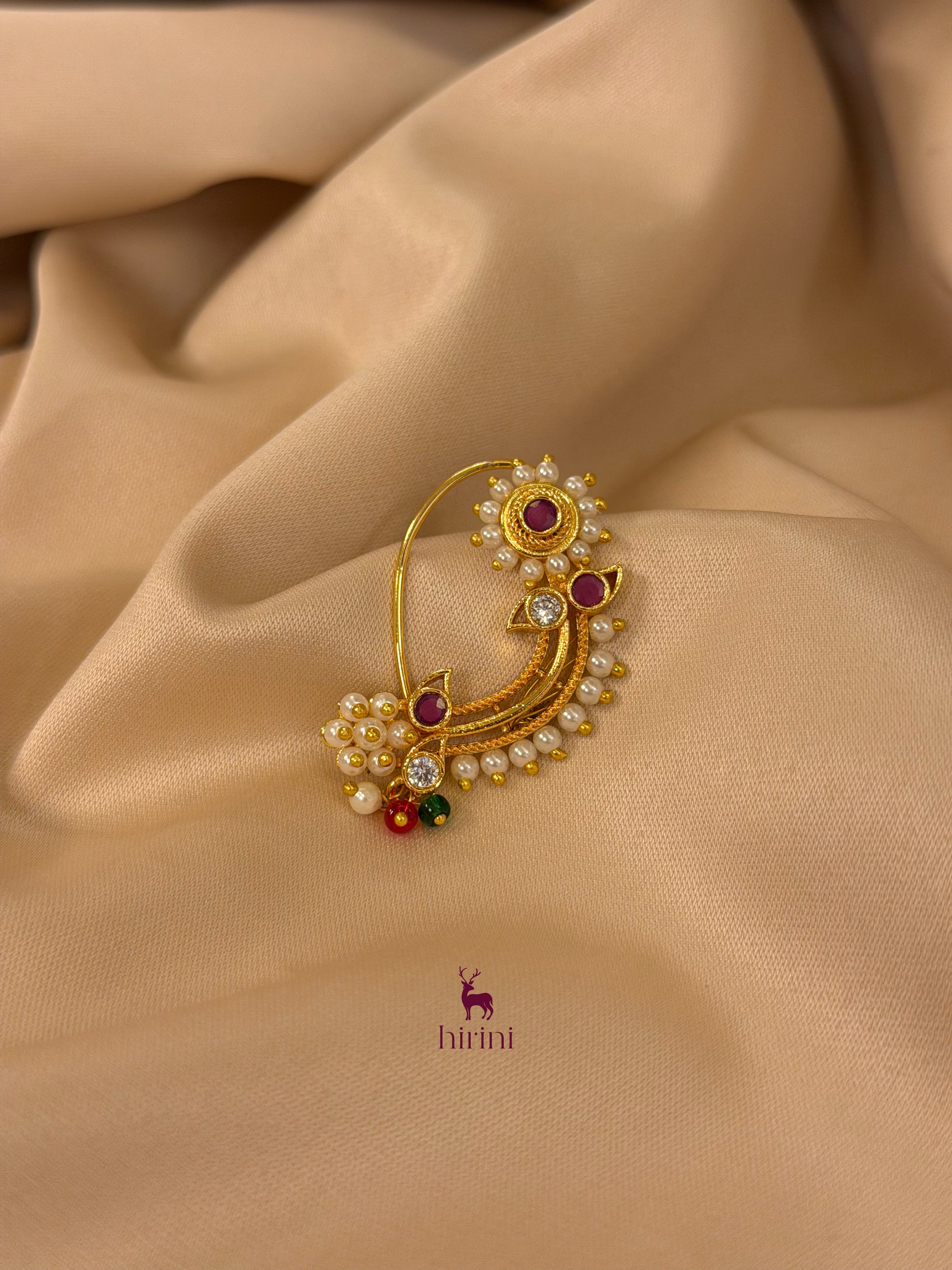 The Anvita Nath embodies timeless beauty inspired by Maharashtrian heritage. Crafted in gold-tone metal, it features intricate detailing of pearls, rubies, and sparkling stones that highlight the classic crescent silhouette. Each curve is designed to add grace and radiance to your festive and bridal looks.