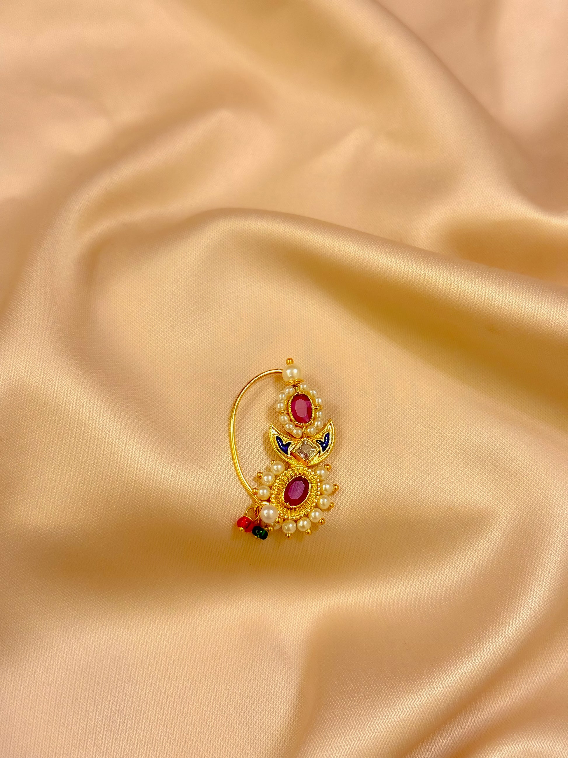 Elegant, traditional, and full of festive charm, the Ratnaleela Nath captures the essence of Maharashtrian beauty with its striking ruby stones and delicate pearl work.