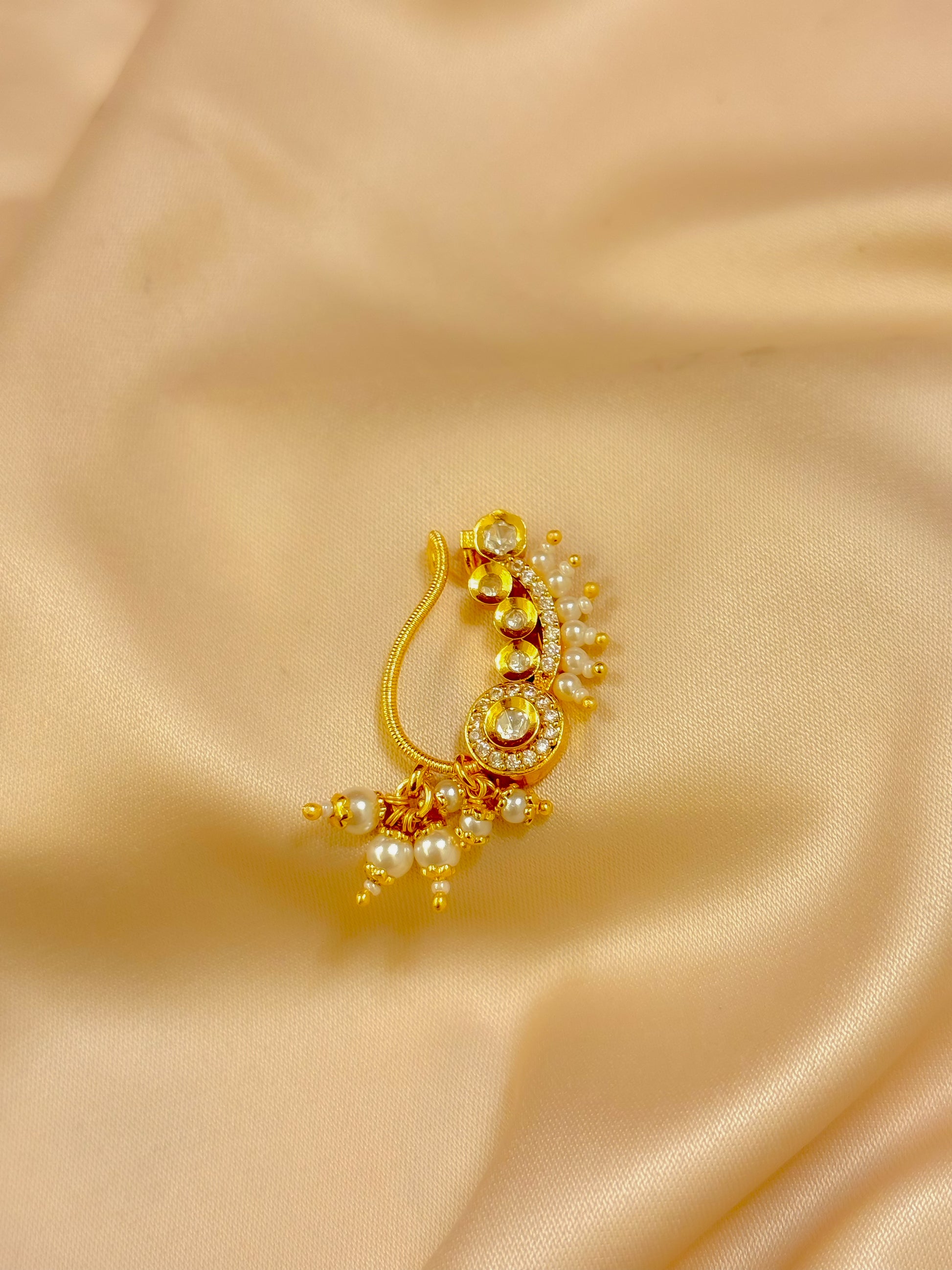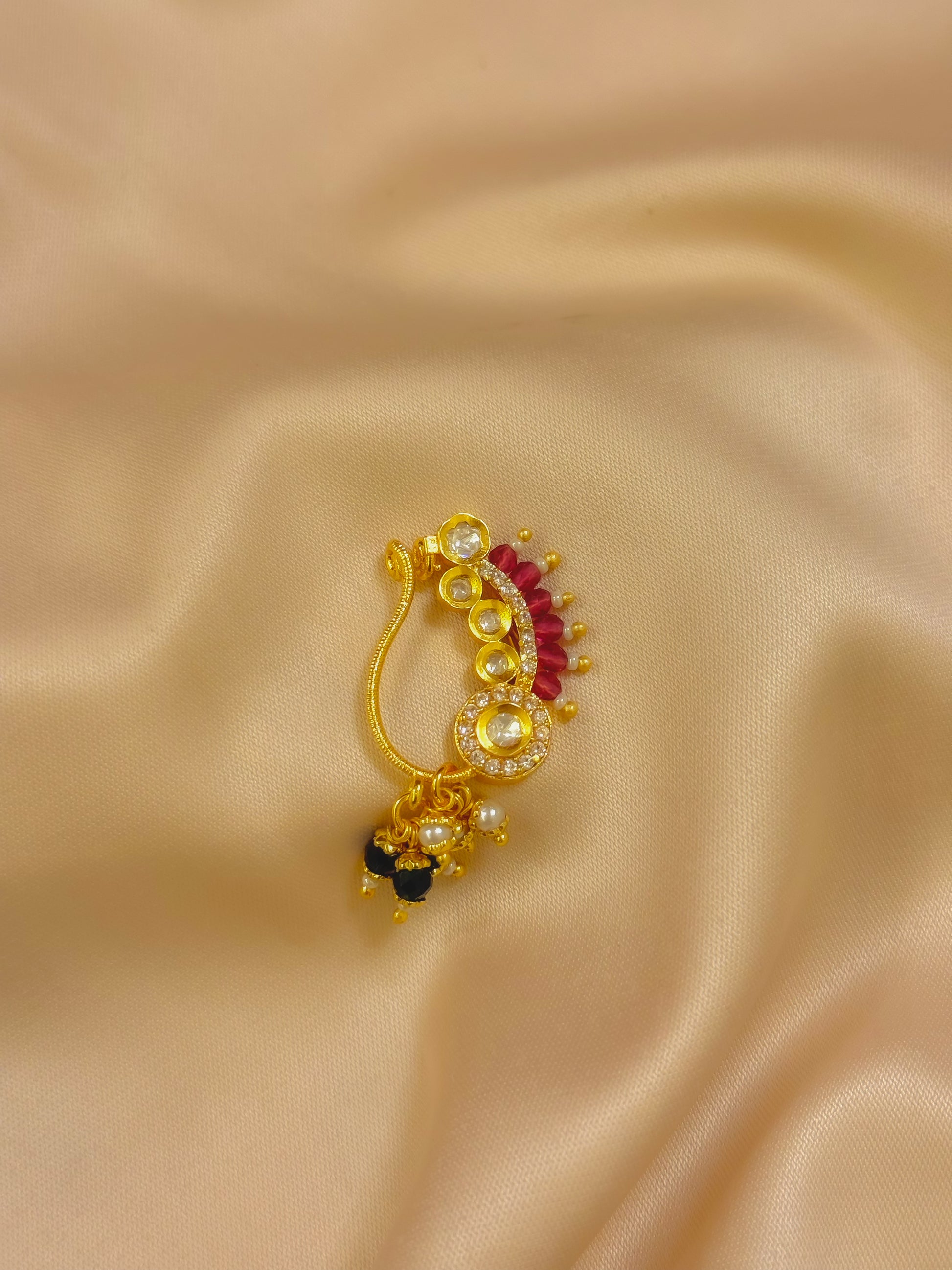 Graceful, vibrant, and rooted in classic Maharashtrian beauty, the Ratrika Nath blends rich ruby tones with luminous kundan stones to create a truly timeless piece.
